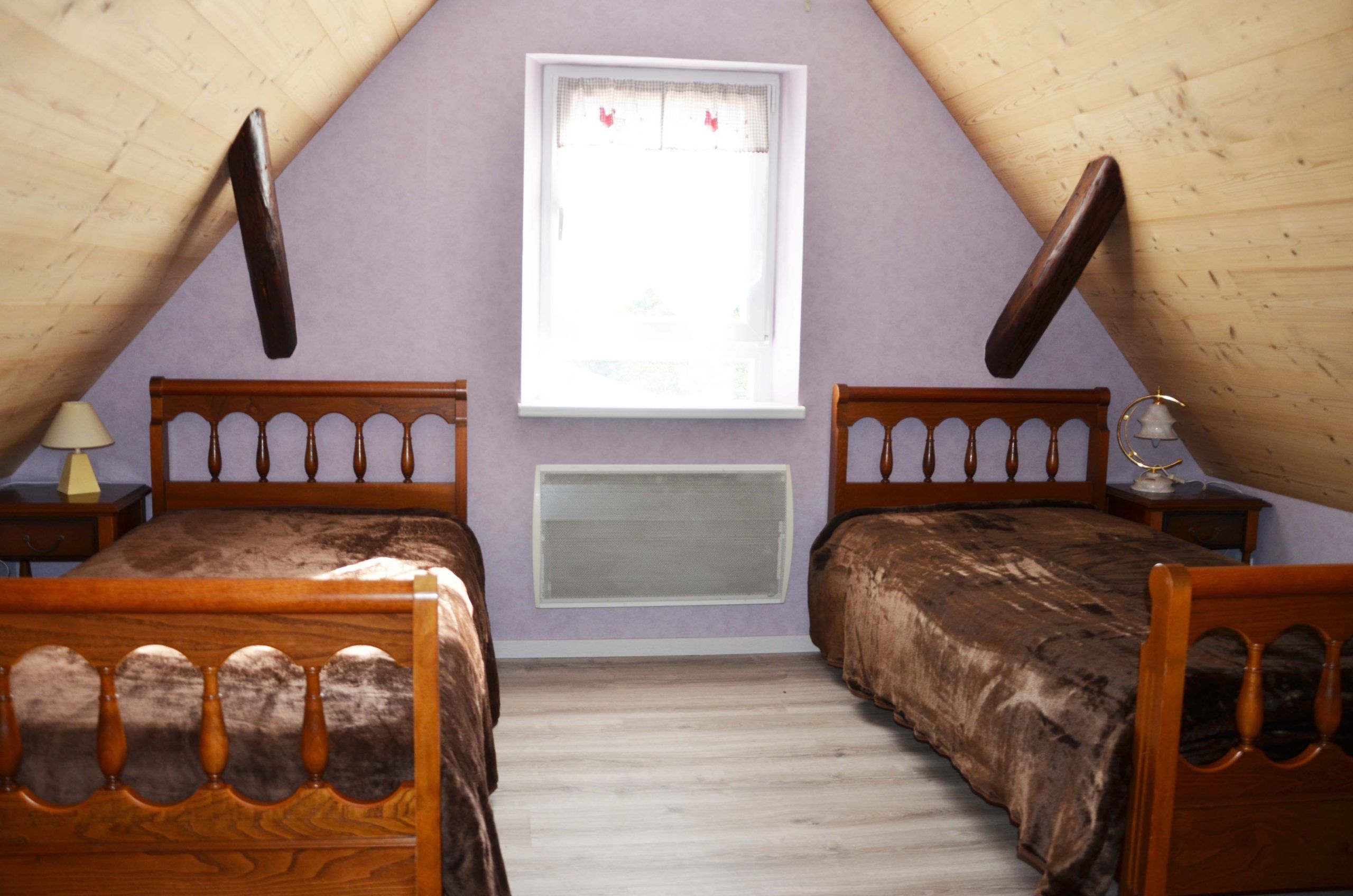 Vous trouverez 2 chambres dont une avec un grand lit 160 x 220 cm et une autre avec 2 lits simples 90×200 cm (que l’on peut rassembler), la vue est dégagée sur une parcelle boisée.